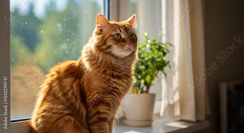 Golden sunlight bathes fluffy ginger cat peacefully gazing outdoors from windowsill. AI Generated