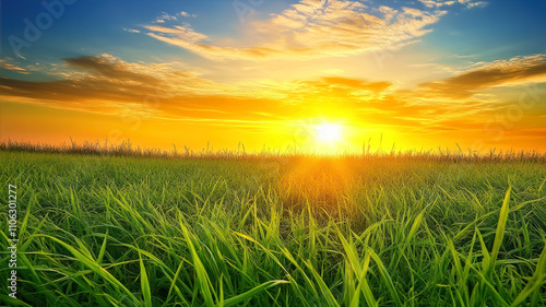 sunset, grass, field, green, nature, sunlight, calmness, serenity, horizon, peaceful, landscape, evening, sky, cloud, vibrant, colours, beauty, warmth, cultivation, growth, environment, rural, scenic, light, flora, agriculture, warm tones, natural, relaxation, idylli, summer, lush, countryside, daylight, dusk, reflections