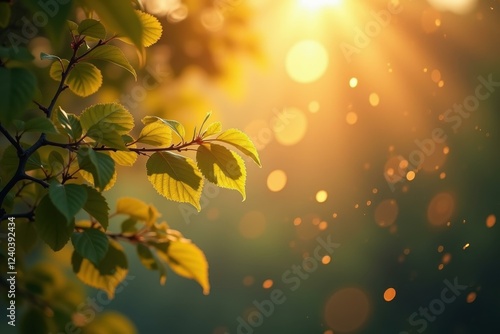 Golden sunlight shining through green leaves with bokeh effect, natural morning atmosphere for relaxation, nature background, outdoor scenery, fresh environment, peaceful mood, summer garden, bright