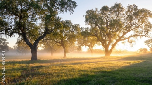 Golden Sunrise Illuminates Misty Field With Majestic Oaks