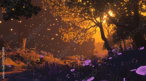 sunset, forest, path, flower, magical, gold, orange, purple, tree, leaf, light, glow, evening, dusk, nature, fantasy, whimsical, aethereal, serene, peaceful, calm, tranquil, mystical, enchanting, dreamlike, autumn, fall, summer, spring, wildflower, meadow, field, grass, plant, foliage, landscape, scenery, vibrant, colours, beauty, artistic, digital, art, illustration, painting