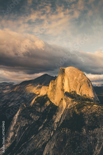 Golden sunset of Half Dome in Yosemite National Park from Glacier Point