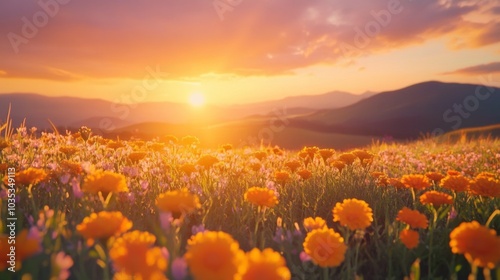 sunset, sky, cloud, mountain, field, flower, orange, yellow, green, meadow, nature, landscape, summer, bright, warm, glow, light, gold, wildflower, bloom, blossom, beauty, scenic, rural, peaceful, tranquil, serene, vibrant, fresh, colourful, beautiful, gorgeous, dazzling, natural, outdoors, horizon, ray, evening, dusk, macro