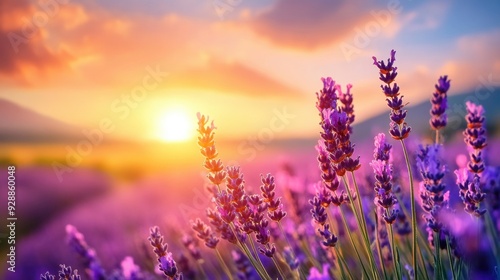 Golden Sunset over a Lavender Field. A stunning golden sunset casting warm light over a vast lavender field in full bloom.