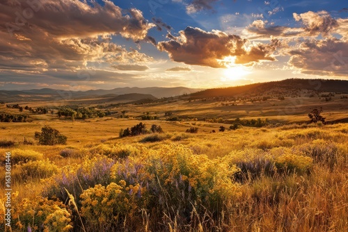 sunset, prairie, landscape, gold, horizon, mountain, cloud, sky, sun, grass, field, hill, meadow, nature, beauty, scenic, view, colours, light, warm, golden hour, dramatic, wide, open, huge, dry, vegetation, plant, flower, yellow, brown, brownish, goldenrod, rural, wild, outdoors, tranquil, peaceful, summer, afternoon