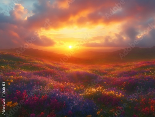 sunset, sunrise, gold, hill, mountain, wildflower, flower, field, meadow, landscape, nature, scenic, beautiful, vibrant, colourful, red, orange, yellow, purple, blue, pink, sky, cloud, sun, light, ray, warm, colours, blooming, blossom, spring, summer, beauty, peaceful, tranquil, serene, idylli, magical, dreamy, fantasy, art, digital, painting, artwork, image