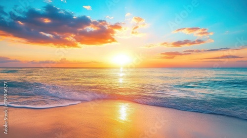 sunset, ocean, beach, sky, cloud, water, sand, horizon, gold, tropical, sea, wave, nature, landscape, coast, shore, sunrise, summer, evening, calm, serenity, calmness, peaceful, beauty, vibrant, colours, warm, blue, orange, yellow, light, hours, daybreak, seascape, vacation, travel, photo, natural, environment, scene