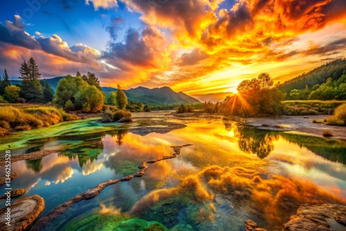 sunset, lake, mountain, landscape, scenic, nature, water, sky, cloud, golden hour, tranquil, peaceful, idylli, vibrant, colourful, river, forest, tree, sunlight, horizon, beauty, environment, outdoors, travel, tour tourism, picturesque, panorama, vista, serene