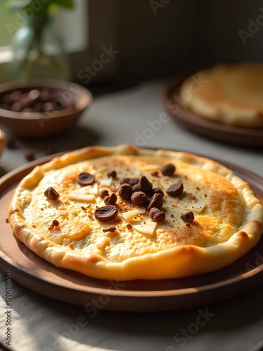 pizza, gold, dark chocolate, food, baked, dessert, pastry, round, brown, sweet, delicious, eating, prepared, closeup, indoor, tasty, fresh, ingredient, snack, baking, epicure, table, window light, food photography, culinary, toned, overhead, studio, warm, plate, minimalist, contemporary, artistic, marketing, receipe, food industry, eatery, advertisement