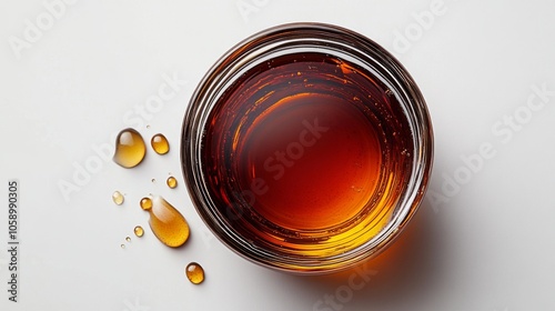 Golden Syrup in a Glass Bowl with Drops on White Background