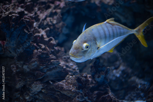 Golden trevally - Gnathanodon speciosus. Trevally close-up. Trevally fish in an aquarium.