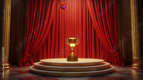 Golden Trophy cup stand on round podium. On Red curtians stage background.
