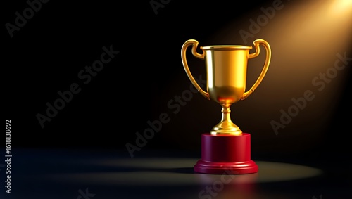 Golden Trophy on Red Base Symbolizing Victory Success and Achievement with Spotlight and Dark Background