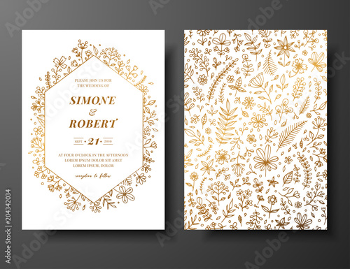 Golden vector wedding invitation with hand drawn twigs, flowers and brahches. Golden botanical template for wedding invite, save the date card, greeting card, place for your text, printable