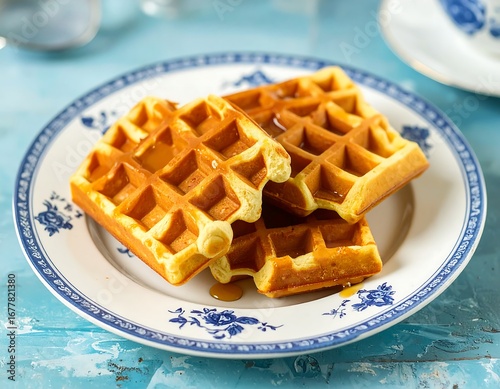 Golden waffles drizzled with syrup