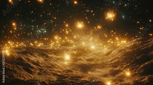 Golden Waves Under Starry Sky with Sparkling Light Effects