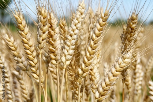 Golden wheat ears in a sunlit field during harvest season showcasing nature's bounty. A field of golden wheat with a blue sky in the background.