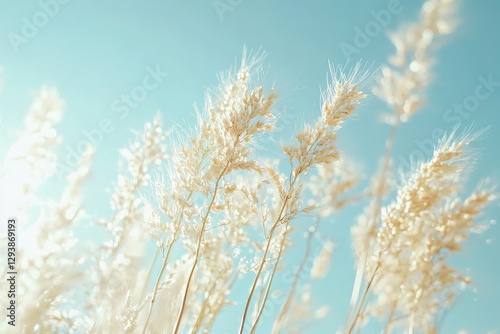 Golden Wheat Field Under a Vast Blue Sky: A Stunning Close-Up of Nature's Bounty, Perfect for Agriculture, Food, and Rural Lifestyle Themes. High-resolution image ideal for websites, blogs,