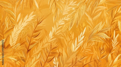 Golden Wheat Field with Abstract Leaves and Textures in Warm Yellow Tones Suitable for Backgrounds or Nature-Themed Designs