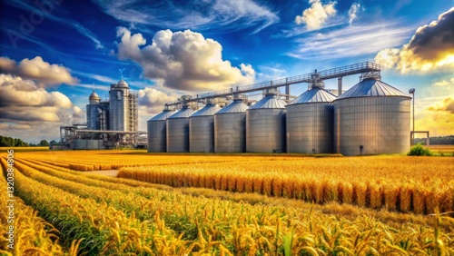 wheat, field, farm, agriculture, silos, storage, crop, blue skies, cloud, nature, rural, landscape, harvest, gold, sunny, summer, growth, farming, industry, production, economy, grain, countryside, tranquil, scenery, shed, horizon, environmentally friendly, sustainability, season, planting, vegetation, farmland, machinery, agricultural, tool, huge, environment, open space, meadow, sky, plant, sunset, fertile, vibrant