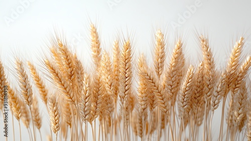 Golden wheat stalks against a white background, detailed closeup, minimalist composition