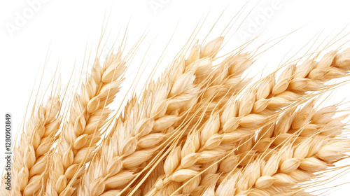 Golden wheat stalks, close-up view of ripe cereal grains, showcasing natural textures, ideal for agriculture-themed projects. Isolated on white background or PNG
