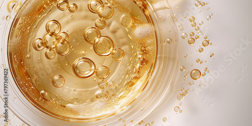 Golden yellow abstract oil bubbles or face serum background. Oil and water bubbles .golden yellow Bubbles oil or collagen serum for cosmetic product, banner poster