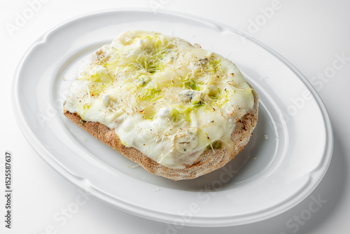 Golden-baked flatbread with melted cheese and fresh herbs, served on a white plate. The dish looks appetizing, rustic, and homemade, ideal for food photography and culinary presentations.