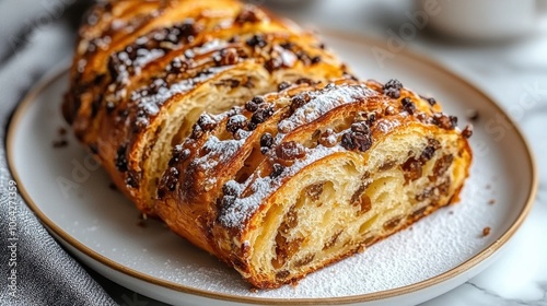 Golden-brown braided pastry filled with raisins and nuts, dusted with powdered sugar, served on a white plate, perfect for a cozy dessert moment.