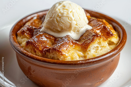Golden-brown bread pudding, perfectly baked, topped with a scoop of creamy vanilla ice cream.