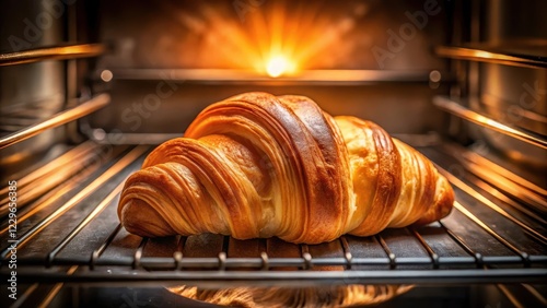 Golden-brown croissant baking in a warm oven, emitting a delightful aroma, ready to be enjoyed