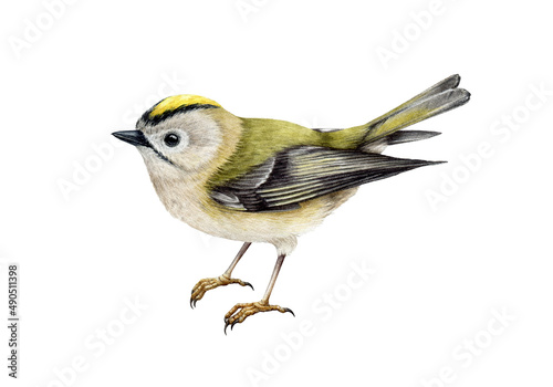 Golden-crowned kinglet bird watercolor illustration. Hand drawn realistic small forest songbird. Regulus regulus illustration. Tiny golden-crowned kinglet on white background