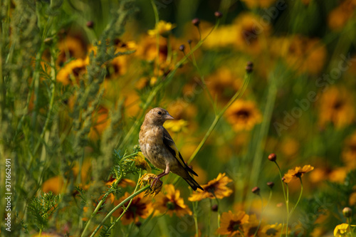 Goldfinch in wild flower meadow with coreopsis - tickseed and poppies