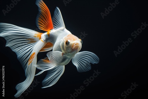 Goldfish swims in black aquarium with orange fins. Close-up of Oranda fish tank with dark background. Fish white body and black mouth visible. Perfect for eco-tech or pet-related content.