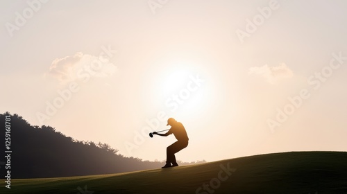 golfer, golf, sunset, putting, hilltop, course, sport, man, silhouette, sun, player, greener, game, leisure, athlete, activity, competition, professional, summer, nature, sky, landscape, background, field, exercise, healthy, lifestyle, recreation, relaxation, hobby, training, practice, tournament, championship, club, ball, swing, shot, fairway, tee, drive, grass, horizon, evening, dusk