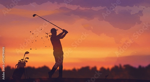 golf, golfer, swing, sunset, silhouette, sky, orange, purple, sport, activity, motion, action, club, equipment, ball, landscape, outdoors, nature, evening, daylight, horizon, field, grass, competition, leisure, recreation, practice, athlete, player, golfing, vector, illustration, background, isolated, design, template, copy space