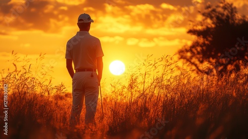 Golfer Silhouetted Against a Vibrant Sunset