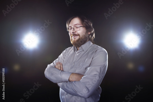 man, expression, portrait, male, young, caucasian, surprise, photogenic, amazement, smile, amazement, astonished, face, boy, stupefaction, wonders, daze, bearded, beard, guy, front, casual attire, clothing, shirt, attractive, clothes, adult, posing, confidence, expressing, lifestyle, emotion, grey, background, positively, humorously, hand, goggles, highlight, spotlight, happy, well, good, smiling, fisheye, successful