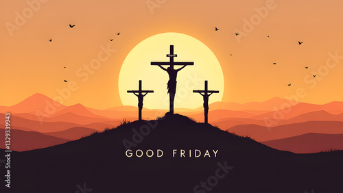 good, friday, crucifiction, jesus christ, jesus christ, cross, faith, religion, christian, easter, sacrifice, salvation, gospel, biblical, spiritual, belief, worship, devotion, resurrection, holy, catholic, prayer, church, sacred, redemption, passion, suffer, forgiveness, god, sunset, silhouette, mountain, background, illustration, artwork, vector, christianity, peace, repent, blessing, scripture, grace, hope, symbol, spirituality
