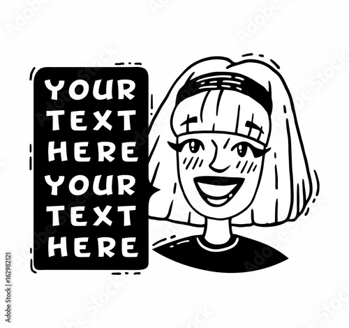 smile, cordial, lipstick, picture, comic, vector, clip art, white background, cartoon, illustration, drawing, humor, head, face, caricature, simple, black, line, woman, female, attractive, portrait, beautiful, young, reddening, make-up, pleasant, speak, talking, cloud, blond, headband