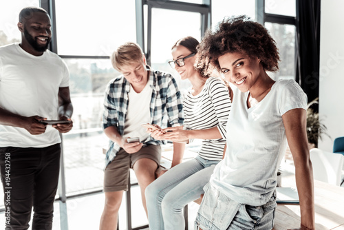 Good mood. Happy positive delighted woman smiling and looking at you while standing together with her colleagues