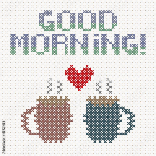 waking, positive, emotion, hot, happiness, greeting, decoration, fun, signs, style, mug, monday, caffeine, hot drink, vector, illustration, drink, design, cup, breakfast, cute, colours, pattern, background, abstract, beautiful, cross-stitch, embroidery, imitation, pink, blue, cappuccino, home, text, good, morning, nubes
