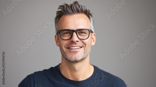 Goofy man with glasses showcasing happiness and quirky facial expressions against a grey studio backdrop. Character-driven model exhibiting comedic reactions.