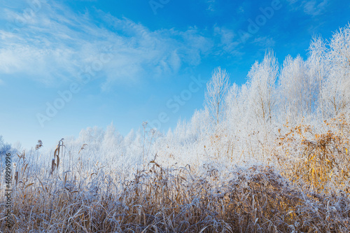 Gorgeous autumn frosty morning. White hoarfrost on trees, bushes, and grass under blue sky with clouds.