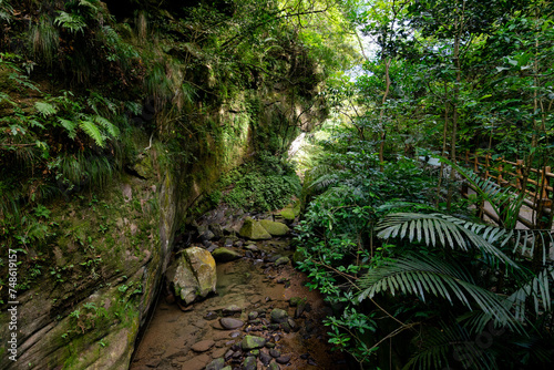 Gorgeous canyon by the river with many plants, and trail by the side, in Nuandong Valley, Keelung city, Taiwan.