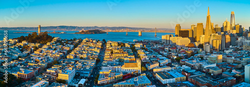 Gorgeous panorama at golden hour with Coit Tower to Transamerica Pyramid skyscraper buildings
