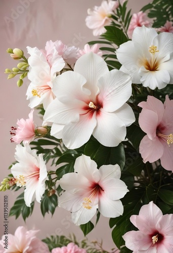 gorgeous white orchids combined with pale pink hibiscus and gardenia in a stunning floral arrangement, mixed flowers, bouquet, white orchids