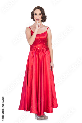 20s, young adult, woman, female, caucasian, white background, attractive, beautiful, beauty, colours, red, evening dress, prom, evening dress, elegant, expression, glamour, make-up, lipstick, coiffure, posing, pretty, sensual, sensuality, style, standing, elegance, gorgeous, lip, make-up, mouth, seductive, sexy, brunette, brown hair, high heel, cut-out, isolated, dramatic, secret, gossip, signs, finger, quiet, silence, confidential, gesture, portrait, happy