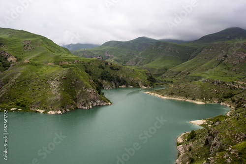 lake, reservoir, water, blue, mountain, cloud, fog, overcast, ravine, slope, green, panorama, array, height, nature, landscape, cold, travel, tour tourism, climbing, summer, caucasia, sky, reserve, vacation
