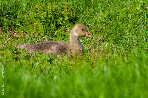 Gosling in green grass. Goose chick grazing in a spring meadow